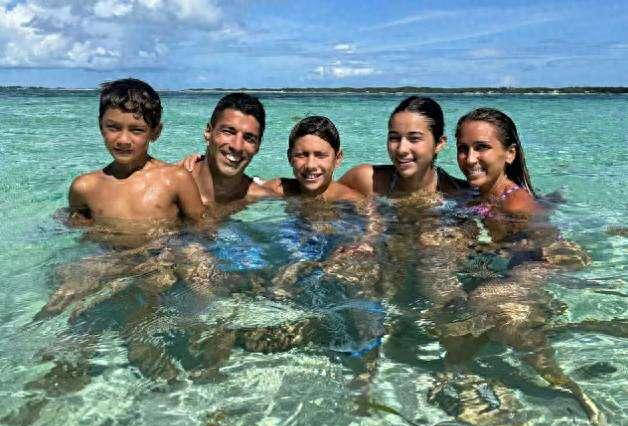 在最近的度假活动中,苏亚雷斯展现出了轻松愉快的状态。他的笑容依旧灿烂,引人注目的大门牙显示出他独特的个性魅力。即使年过三十八,苏亚雷斯依然展现出优秀的体能素质,赤裸上身散发出肌肉线条之美,彰显出他长期的自律与锻炼。而他的妻子同样养尊处优,身材窈窕、容貌姣好。三个孩子各具特色,两个男孩继承了父亲的英俊,女儿则继承了母亲的美貌。
